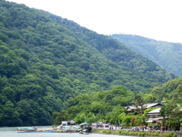 Arashiyama is just a short train ride from central Kyoto, but seems a world away, with its mountain backdrop, green leafy streets and river-side setting. The best part of our visit was definitely the Torokko Scenic Train. This slow old train winds its way up through the Hozu Valley, alongside the Hozu River (Hozugawa), revealing epic vistas around every bend, and breaking your back in the process. It’s a very scenic ride, but also a VERY rough one – the seats are hard, wooden benches with no allowances made for Western sensibilities at all. Still well worth the trip though; Japanese hills/mountains are really impressive – they’re sooo steep and densely forested, and so GREEN. We just don’t see much of that kind of green at home – the Aussie bush is kind of a dirty greeny-browny-grey at the best of times. Japanese forests are awesomely green at this time of year, with very little undergrowth, lots of leaf litter and numerous rivulets and streams running down the mountain-sides. Very pretty.
