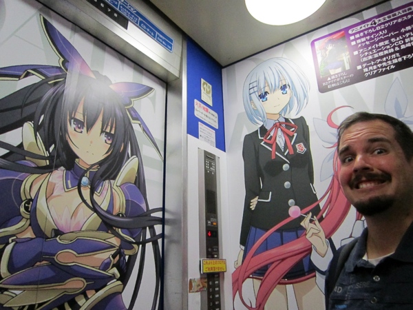 Even the inside of the lift was covered in giant posters of anime characters.