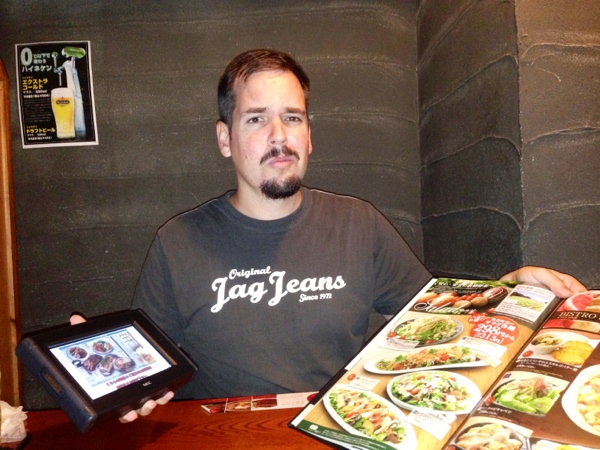 It was an awesome final day in Tokyo – full of colour and sound and chaos, just as we had hoped! For our last evening in Tokyo we decided to treat ourselves and went out for dinner to a “fancy” restaurant where we had to take our shoes off and got shown to a private booth. “This is nice,” we thought. The waitress then gave us each a menu and an iPad and, errrrr…., disappeared. The iPad thingy had all sorts of buttons and pictures of food all over the screen, with plenty of useful instructions IN JAPANESE. It took Shane a while to decipher the important bits of Japanese writing, but we worked out that we had to place the order ourselves on the iPad. No waitress; we just press the right buttons on the touch screen and the order would magically be transmitted to the kitchen, from whence our food would appear. Sounds like a great system, except for the fact that all the buttons and menus on the iPad thingy WERE IN JAPANESE. No nice lady to ask questions to. Wild gesticulation (my main form of communication in Japan) ain’t going to work with a machine, now is it??