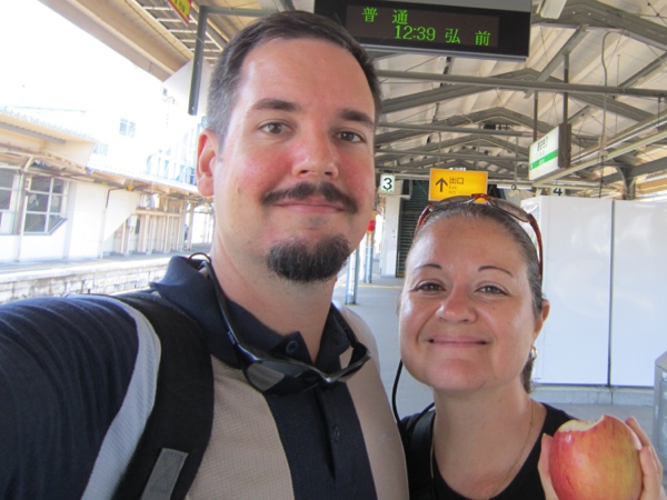 Aomori is the most northernly prefecture in Honshu, Japan’s central island. This large, but sparsely populated, province is primarily farmland, with rice and Aomori apples being the major products. Famous around Japan, these apples are big and juicy – a great snack for 2 hungry travellers, as you can see below.