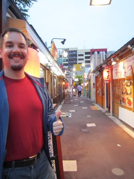The verdict for dinner was that noodles and hot soup were required (it’s cold up here tonight – 10C cold!). So went in search of a ramen noodle bar and found the tiniest little place. It was one of 20 odd micro-restaurants in this little food alley. Squeezed between a couple of izakaya (translation = Japanese pub that serves beer and grilled nibbles), this place had 8 seats in it and served a few variations of just 3 things: gyoza, pork ramen or corn ramen. Not being great fans of porcine meals (except for prosciutto and the odd bit of breakfast bacon), we went for the corn ramen. What we didn’t expect was that the corn noodles would also come with pork, a generous serving of chilli paste and a BIG DOB OF BUTTER. Apparently this is the speciality up here in Hokkaido, designed to be served to hungry sailors and skiers (and ignorant tourists) on cold wintery days to help warm them up and give them sustenance. Shane was initially afraid of the butter and chilli, but all proved well and we thoroughly enjoyed our ramen – butter, chilli and all. Good work Japan – we needed a bit of fattening up! NOT!
