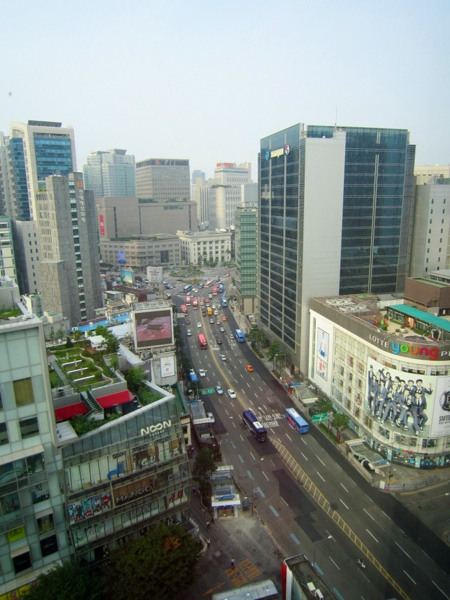View of Myeong-dong’s shopping mall strip from our hotel.