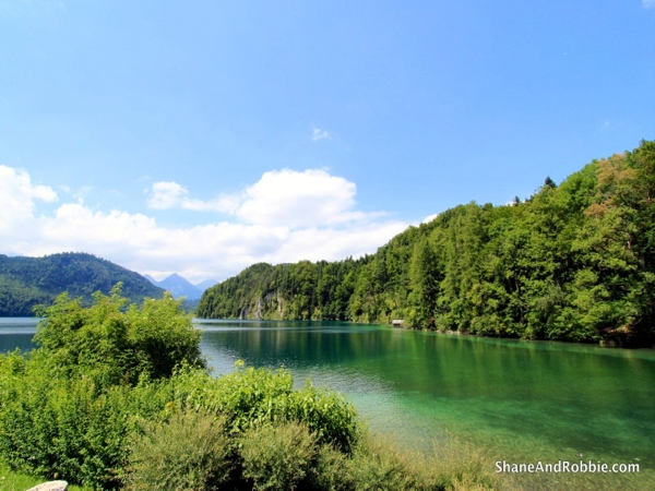 Both Neuschwanstein and Hohenschwangau have perfect views over the surrounding farmland, forest and the 2 alpine lakes: Schwansee and Alpsee. The natural setting of these castles is beautiful and we were lucky enough to have the time and opportunity today to hike around Lake Alpsee along forest trails where we actually found ourselves alone and able to enjoy the peace and quiet of the lake. The waters of the lake are so crystal clear and clean that it was very tempting to just strip off to our underwear and go for a dip!