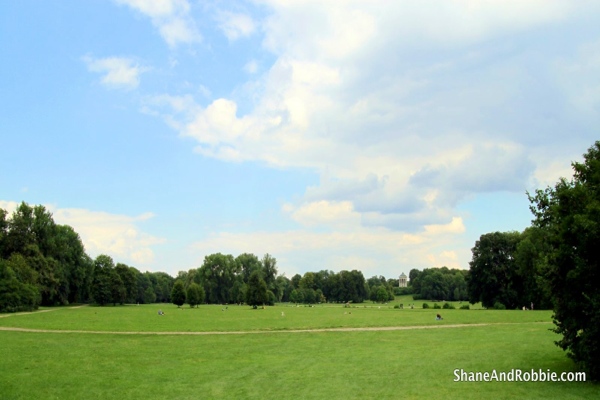 Back across the river we drove past the Englischer Garten (translation = English Garden), a 900 acre public park built in 1789 and landscaped “in the English style” (i.e. lots of grass, ponds, man-made streams and flowers). We stopped at the English Garden for some lunch and a stroll – very pleasant indeed. We even stopped to watch the surfers for a while (at the mouth of the artificial stream that runs through the Englischer Garten, there is a standing wave produced by the water pumping mechanism; surfers attempt to surf on this standing wave). Other highlights of the English Garden, were: