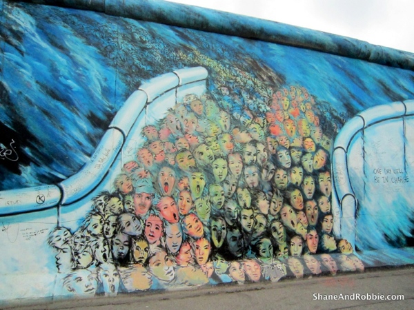 The Berlin Wall. A 1.3km section of the wall has been left standing and is open to the public. The Western side of the wall has been left covered in graffiti, as it was 23 years ago; the Eastern side of the wall, once blank concrete, is covered in murals done by invited artists to memorialise what the Berlin Wall once represented and what its collapse meant for Germany.