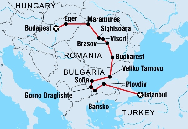 After our orientation walk we all went out to dinner together as this part of the tour finished today and this was our last evening together as a group. Most of our tour group is finishing here, having done the Vienna to Budapest leg of the tour; the next leg of our tour (from Budapest to Istanbul – see map below) starts on Monday morning and we can only hope the people that join us for the second half of the trip are as easy company as our first tour group has been! It’s actually been quite interesting doing this 2 weeks trip through Central Europe with Intrepid – we’ve enjoyed it more than we thought we would. Generally we’re not really “tour” people as we prefer to do things on our own as much as possible, but it’s been good having a tour guide that spoke the language through Czechia, Poland and Slovakia as neither of us have any idea about any of the Slavic languages! And the Intrepid style of touring seems to suit us as you get heaps of free time to do your own thing with just enough hand-holding to make us feel comfortable in each new place. The tour was also great in that it took us to some very small, out-of-the-way places that we wouldn’t have otherwise been able to see due to their remoteness. We were also really fortunate that the group of people we shared the 2 weeks with were such great company!