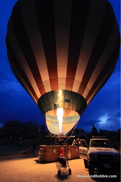 Our day started at the ungodly hour of 4:30am when our alarm went off. Barely 30 minutes later, bleary eyed and barely cognisant, we shuffled onto the mini-bus that was sent to pick us up form our hotel and take us out to the hot air balloon “lift off zone”. From our perspective the “lift off zone” looked a lot like a large, dusty, deserted field – quite under-whelming really. Within a few minutes, however, we had hot cups of coffee pressed into our hands and hot air balloons (with baskets) were being delivered left, right and centre. As the balloons were inflated the field quickly transformed into a noisey, colourful fairground with hundreds of excited, eager tourists like us milling around, waiting to jump on board. After an incredibly smooth take off we were up and floating above Cappadocia. The views were amazing, and the flotilla of hot air balloons around us just added to the spectacle. It was a wonderful way to start the day and a great way to see a bit more of the Goreme Valley! Here are just a few of our favourite photos from this morning…